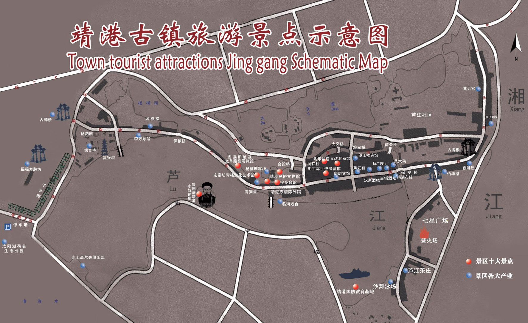 靖港,原名蘆江,地處溈水入湘江口,多洲灘,蘆葦叢生,故名。唐武德四年,內(nèi)亂頻仍,高祖皇帝李淵派大將軍李靖南下戡亂。李靖駐兵蘆江,“軍令嚴(yán)整,秋毫無犯,百姓德之,名其水曰靖港,以志不忘!庇谑牵J江始更名靖港。逮及清末民初,航運(yùn)業(yè)日趨發(fā)達(dá),靖港以其天然良港之優(yōu)勢,成為船只進(jìn)出長沙的北大門和避風(fēng)港,每天停靠的船只數(shù)以千計(jì)。湘陰、益陽、寧鄉(xiāng)及本地糧食土產(chǎn)多在此集散,曾為湖南四大米市之一,商賈云集,市場活躍,時(shí)稱“小漢口”。當(dāng)時(shí)流傳著一句俗語,“船到靖港口,順風(fēng)也不走”,足見其盛。 古鎮(zhèn)現(xiàn)保存“8街4巷7碼頭”,民居1008棟,主街道長1275米,有數(shù)十處古商鋪、作坊、會(huì)館、廟宇和極具紀(jì)念意義的遺址,其中,“宏泰坊”、“寧鄉(xiāng)會(huì)館”、“當(dāng)鋪”、“育嬰堂”等明清古建筑保存較為完好。原臨河所建房屋均為吊腳樓,獨(dú)具江南水鄉(xiāng)特色,蔚為壯觀。古鎮(zhèn)內(nèi)遠(yuǎn)近聞名的還有“復(fù)興塔”、“觀音廟”、“紫云宮”等數(shù)處宗教建筑,朝有千人作輯,夜有萬盞明燈,香火旺盛,場面壯觀。 2008年7月,靖港古鎮(zhèn)保護(hù)與開發(fā)正式啟動(dòng),同年9月,靖港鎮(zhèn)榮獲“中國歷史文化名鎮(zhèn)”稱號(hào),古鎮(zhèn)的保護(hù)與開發(fā)已納入省、市重點(diǎn)工程。作為中國歷史文化名鎮(zhèn),靖港的發(fā)展目標(biāo)定位為國家5A級(jí)旅游景點(diǎn),成為長株潭城市群中獨(dú)具特色的都市型休閑度假基地。