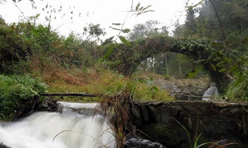 仙人橋景點(diǎn)位于攸縣酒埠江風(fēng)景區(qū)太陽山景區(qū)漕泊鄉(xiāng)的七里村,屬典型的客斯特地貌,是原有地下石灰?guī)r溶洞在地殼抬升作用下大部分頂蓋塌陷以后,保留下來的一塊頂蓋形成的一座天然石橋。石橋下洞高60余米,橋面長約20米,兩頭窄,中間寬,最窄處僅50厘米左右,最薄處也僅2米。此橋天造地設(shè),鬼斧神工。