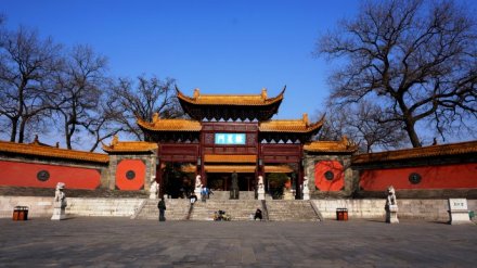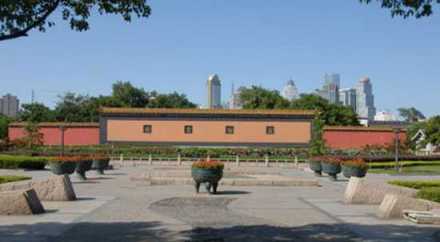 “萬仞宮墻”照壁面臨運瀆,全長近百米。照壁南側有四個磚刻大字“萬仞宮墻”,每個字約1米見方。仞,是度量單位,我國古代八尺或七尺叫做一仞!叭f仞宮墻”出自《論語·子張篇》:“……夫子之墻高數(shù)(萬)仞,不得其門而入”,意思是贊喻孔子知識淵博,道德文章水平非常之高。
