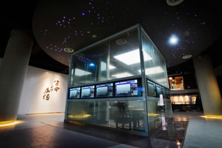 數(shù)字館位于民國館北側(cè)地下,由實(shí)體展館和網(wǎng)絡(luò)虛擬館構(gòu)成。實(shí)體館約1200平方米,用抽象概念輔以歷史事實(shí)的表現(xiàn)方式詮釋中華文明發(fā)展歷程,總體風(fēng)格時(shí)尚亮麗。突破“以展柜和展板為主”的傳統(tǒng)展陳方式,采取“不封死、不看穿”錯(cuò)層交疊的空間構(gòu)建手段,集合分列式多屏幕、透明屏、二維碼等多媒體形式,運(yùn)用實(shí)時(shí)摳像、動(dòng)作捕捉等數(shù)字技術(shù),將空間、裝飾、媒體硬件及數(shù)字內(nèi)容結(jié)合起來,營(yíng)造立體豐富的展示環(huán)境,引導(dǎo)觀眾沿著流線移步換景。網(wǎng)絡(luò)虛擬館通過網(wǎng)絡(luò)和圖像識(shí)別技術(shù)復(fù)原實(shí)體展館的空間和內(nèi)容,是實(shí)體展館的延伸。以網(wǎng)絡(luò)為平臺(tái),觀眾自己制作的展示內(nèi)容,通過遴選的,也可推送到實(shí)體展館。實(shí)體展館分為六大展區(qū),序廳:以《時(shí)光》為題,通過流水、風(fēng)沙、變幻的星空,體現(xiàn)“時(shí)間”對(duì)于人類文明的獨(dú)特作用,營(yíng)造時(shí)間飛逝,萬物滄桑的情境感。萌動(dòng)與發(fā)軔:用獨(dú)具風(fēng)格的影像勾勒出初生的人類試圖征服自然時(shí)表現(xiàn)出的勇氣與“傻氣”。進(jìn)取與成長(zhǎng):體現(xiàn)中華文明的快速發(fā)展。用歷史故事表現(xiàn)“熱血青年”、“因?yàn)閻矍椤、“君子愛?cái)”、“意氣風(fēng)發(fā)”等人生路上的喜怒哀樂。擴(kuò)張與融合:用立面寬12.5m,高5.9m的C形巨幕影片,以戰(zhàn)爭(zhēng)、帝國故事表現(xiàn)人類進(jìn)步過程中的豪邁激越、堅(jiān)韌不拔以及全盛時(shí)期的聲色犬馬、宗教宣揚(yáng)。封閉與開放:截取閉關(guān)鎖國、鴉片戰(zhàn)爭(zhēng)、文明絲路中的歷史片段,表現(xiàn)中華文明從開拓進(jìn)取逐漸轉(zhuǎn)向內(nèi)斂、保守、固步自封的心態(tài)。生命因你永恒:總結(jié)在初生、發(fā)展、強(qiáng)盛、衰落這一螺旋式漸進(jìn)的歷史進(jìn)程中,文化和民族產(chǎn)生了融合,政治制度、科學(xué)技術(shù)和文化藝術(shù)也在不斷成熟、進(jìn)步,文明向更加美好和睿智的方向前進(jìn)。