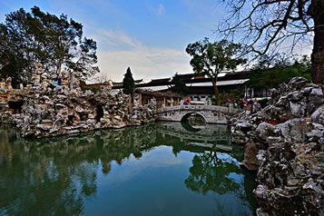 園內(nèi)水體聚中有分。聚合型的主體水池中心有亭佇立,曲橋連亭。在園西假山深處,山石做懸崖狀。一股清泉經(jīng)湖石三疊,奔瀉而下,形成了蘇州古典園林引人注目的人造瀑布。園中水景豐富,溪澗泉流,迂回于洞壑峰巒之間,隱約于林木之中,藏尾于山石洞穴。