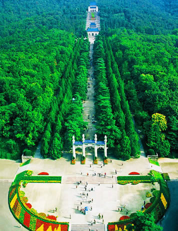 中山陵前臨平川,背擁青嶂,東毗靈谷寺,西鄰明孝陵,整個建筑群依山勢而建,由南往北沿中軸線逐漸升高,主要建筑有博愛坊、墓道、陵門、石階、碑亭、祭堂和墓室等,排列在一條中軸線上,體現(xiàn)了中國傳統(tǒng)建筑的風格,從空中往下看,像一座平臥在綠絨毯上的“自由鐘”。中山陵建筑融匯中國古代與西方建筑之精華,莊嚴簡樸,別創(chuàng)新格。