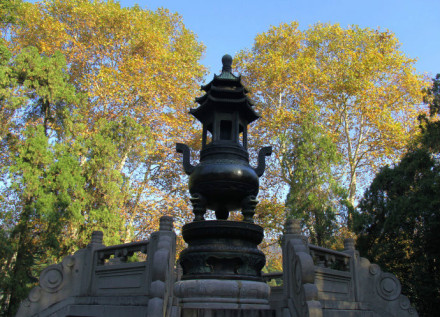1933年05月07日,在這里舉行了莊嚴的銅鼎奠基典禮。國民政府主席林森親臨現(xiàn)場,戴季陶致詞。致詞畢,戴季陶和辛樹幟倆人小心翼翼地將一只銅箱共同放入石匣中,銅箱面刻戴季陶所書的《總理遺囑》,箱內(nèi)貯存著中山大學在南京的師生所恭錄的《總理遺教》。銅箱放入石匣后,由戴季陶將水泥注入石匣內(nèi)封固,然后,將石匣徐徐放入距地面深約三米的地基中。隨后,建造石臺,鑄造銅鼎。由此,中山陵園又添新景觀。