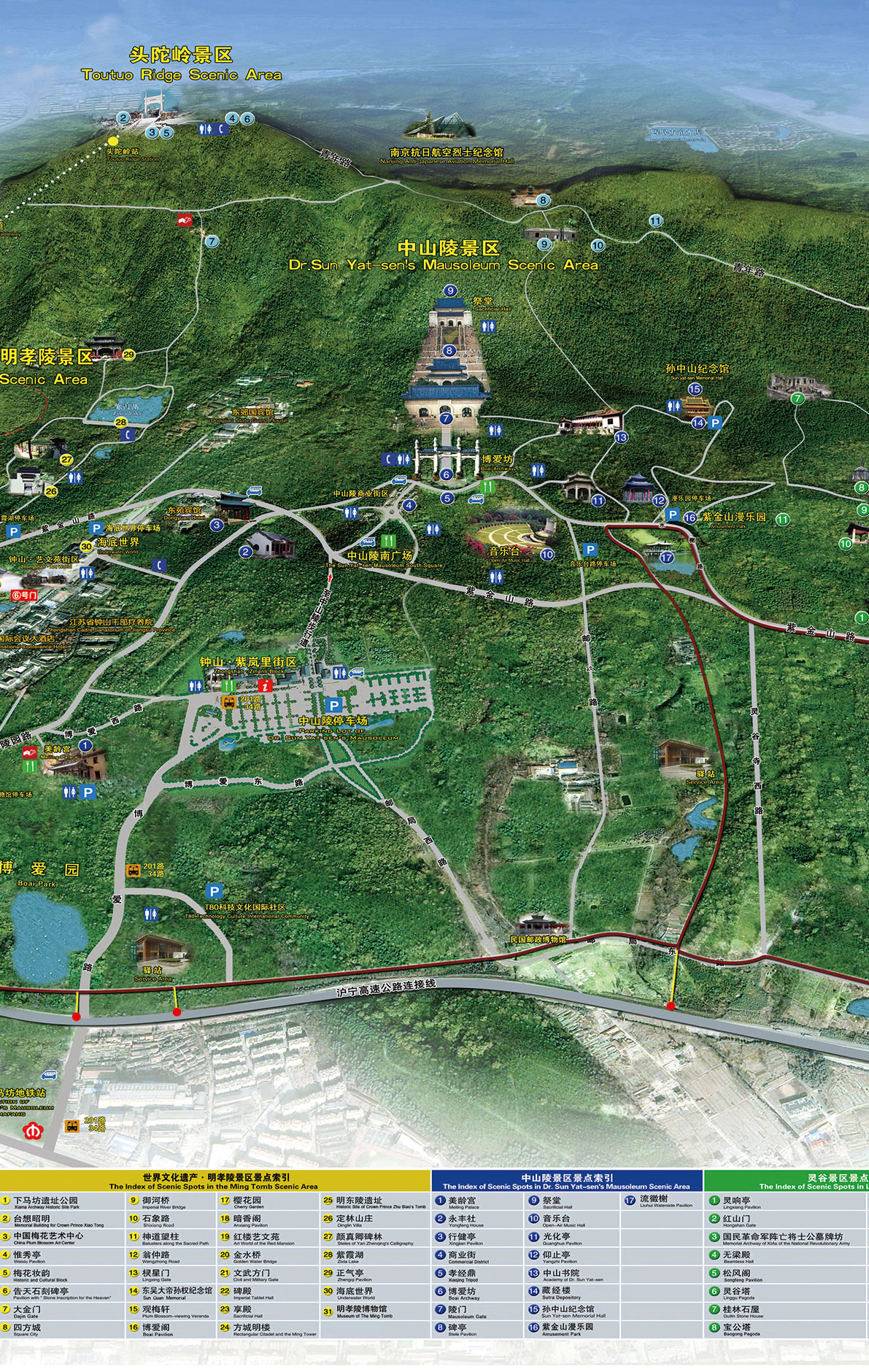 中山陵附近,長眠著近代民主革命時期的一些風云人物,如孫中山的親密戰(zhàn)友和國民黨政要等。1928年,國民政府決定在中山陵東側的靈谷寺址改建國民革命軍陣亡將士公墓,增建牌坊、紀念堂及紀念塔。在由靈谷寺無梁殿改建的紀念堂內(nèi),鐫刻著北伐、抗日諸役陣亡將士姓名軍銜,據(jù)計當時共刻碑10塊,有人名33000多個。鐘山北麓,還有座莊嚴肅穆的航空烈士公墓,墓碑上刻著3306位為抗日而捐軀的中、美、蘇等國烈士姓名。