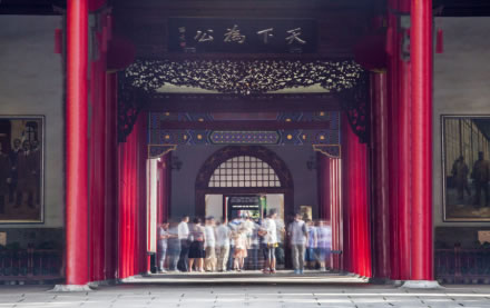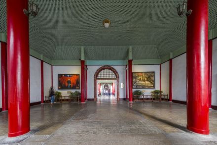 紅柱灰瓦、方磚鋪地的大堂建于太平天國(guó)榮光大殿原址,大堂正中懸掛孫中山手書(shū)“天下為公”橫匾。大堂后有東、西廂房各一,其后由封閉的西式通體方格毛玻璃封閉穿堂與二堂相連。穿堂東面是一清代四合院,西面是大禮堂。