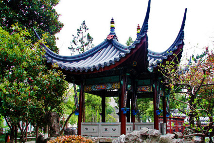 方勝亭,俗稱"鴛鴦亭",是民國(guó)前江南惟一的方勝亭。方勝,又稱雙菱,指兩菱形相疊。亭基方勝,上為雙頂、遠(yuǎn)觀似雙亭并立,近看卻一亭獨(dú)佇,小巧玲瓏,頗為別致。飛檐翹角,如欲飛的鴛鴦。梁柱間有很大的彩繪"雀替木",這是清代建筑的特征之一。因其少用斗拱,為出挑檐,只得加大這種斜角支撐物。亭里可見(jiàn)一些龍鳳獅虎等動(dòng)物形狀的刻繪。