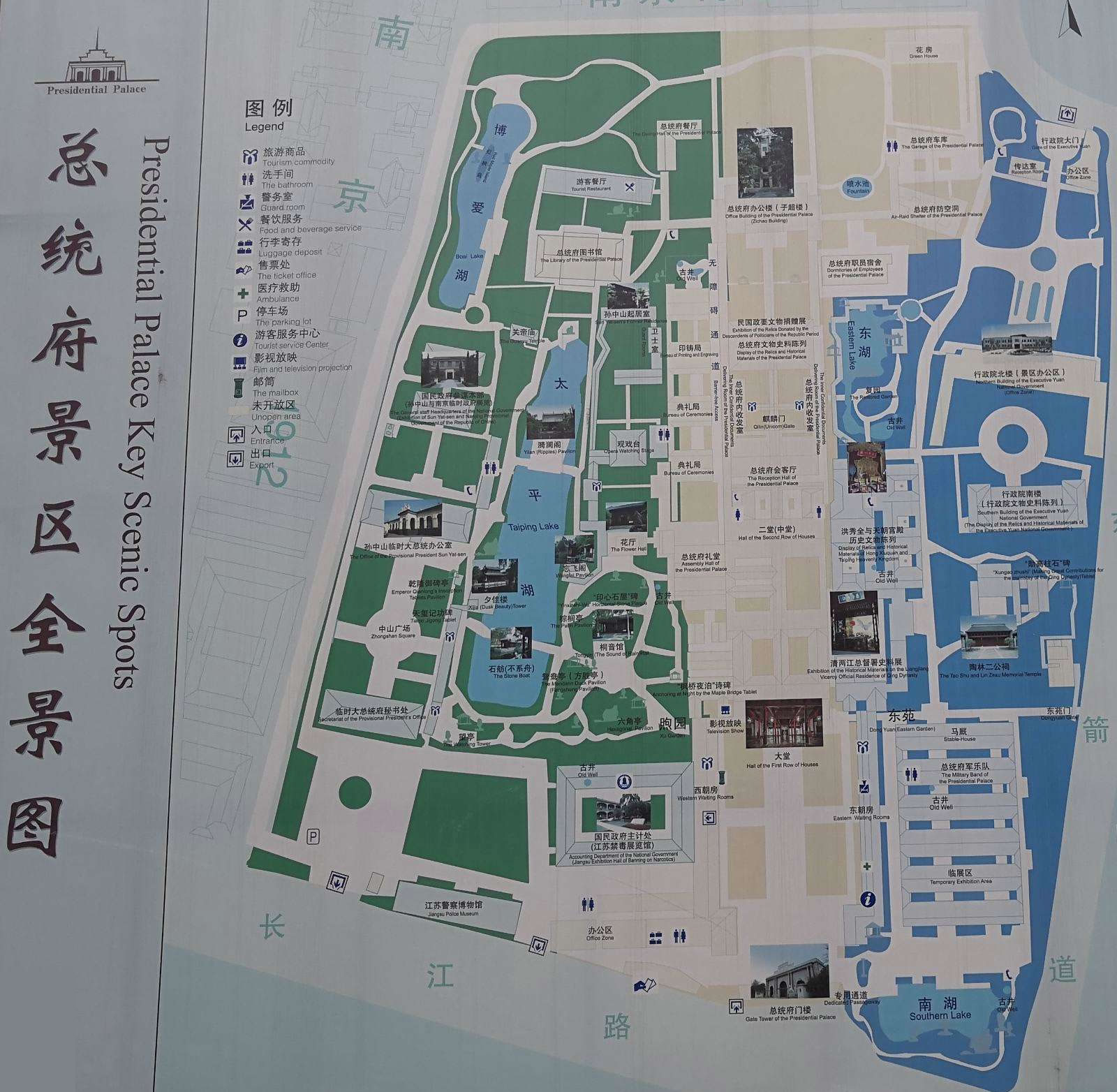 總統(tǒng)府(中國(guó)近代史博物館)占地面積9萬(wàn)平方米,共分三個(gè)參觀區(qū)域。中區(qū)(中軸線)主要是國(guó)民政府、總統(tǒng)府及所屬機(jī)構(gòu);西區(qū)是孫中山的臨時(shí)大總統(tǒng)辦公室、秘書(shū)處和西花園,以及參謀本部等;東區(qū)主要是行政院舊址、馬廄和東花園。一系列展館和史料陳列,則分布在這三個(gè)區(qū)域中。