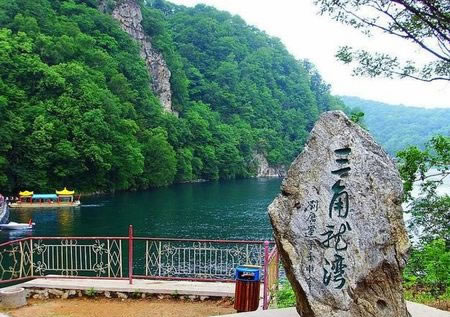 三角龍灣又名黑龍?zhí),傳說有一條三只角的黑龍距此修煉,經(jīng)常行云布雨,除惡降魔,普濟(jì)四方百姓,后來黑龍飛往長白山天池,龍去留淵,留有一灣圣水。位于輝南城朝陽鎮(zhèn)東南45公里處的高山密林之中。系古代火山噴發(fā)口積水而成,因水面呈三角形,加之湖南側(cè)矗立著30米高的三角石,故名“三角龍灣”。是進(jìn)入長白山的門戶之一。這里自古以來風(fēng)光秀美,景色迷人。我國著名第二大火山群—龍崗火山群就分布在這里。