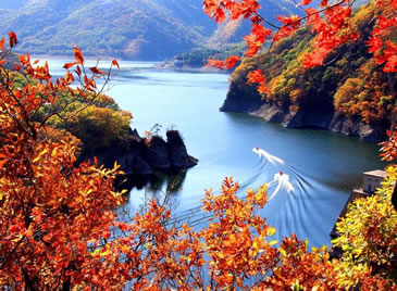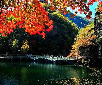 關(guān)門(mén)山是以楓葉著稱(chēng)的,楓葉多得讓你數(shù)不過(guò)來(lái),美得讓你感覺(jué)像是走進(jìn)了仙境,紅得是一團(tuán)大火焰。這里的楓葉一片綴連著一片,一株綴連著一株,像火焰,像扇子,形態(tài)萬(wàn)千,千姿百態(tài)。關(guān)門(mén)山的楓葉不僅美麗,而且山也是那般雄偉,水也是那般清澈。