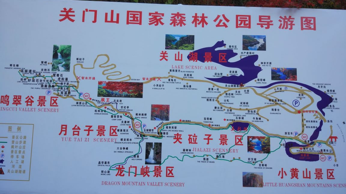 森林公園內(nèi)有四大景區(qū)小黃山景區(qū)、夾砬子景區(qū)、龍門(mén)峽景區(qū)和月臺(tái)子景區(qū),共計(jì)108處景點(diǎn)。它有三道門(mén):北門(mén),在小市方向,雙峰對(duì)峙,中間拱橋相連;南門(mén),在去湯溝的嶺頂,公路從中穿過(guò),十分險(xiǎn)要;中門(mén),在深谷河道中,“雙扉”夾水,寬只二十余米,為興修水庫(kù)的天然門(mén)柱,有人把關(guān)門(mén)山風(fēng)景譽(yù)為“小江南”,“賽黃山”,說(shuō)它有五美:山美,陡峭,俊秀,似一簇簇盆景;樹(shù)美,樹(shù)木種類(lèi)繁多,特別是秋天的楓葉,冬季植根于峭壁上的蒼松,非常壯觀(guān);水美,湯河穿過(guò)山谷,匯集小溪,飛瀑,“奪門(mén)”而出,似來(lái)自于天際;花美,天女木蘭,山杜鵑,漫山遍野;云美麗,清晨雨后,山谷中云霧繚繞,如披輕紗,分外嫵媚。歷代文人多有詩(shī)篇贊頌,許多美術(shù)工作者,經(jīng)常到這里寫(xiě)生、作畫(huà)。