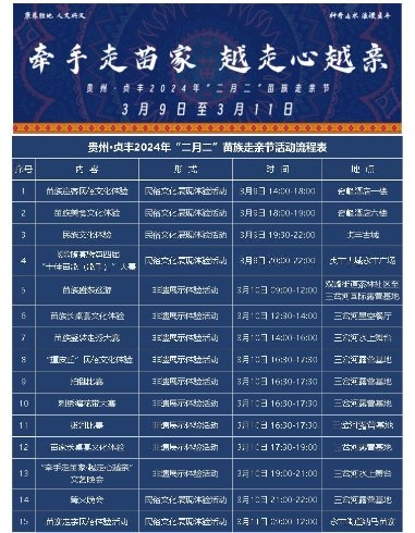 2024年3月9日至11日,貴州貞豐將迎來盛大的“二月二”苗族走親節(jié)活動。本次活動由貞豐縣苗學(xué)會主辦,貞豐縣雙峰文旅集團(tuán)協(xié)辦。