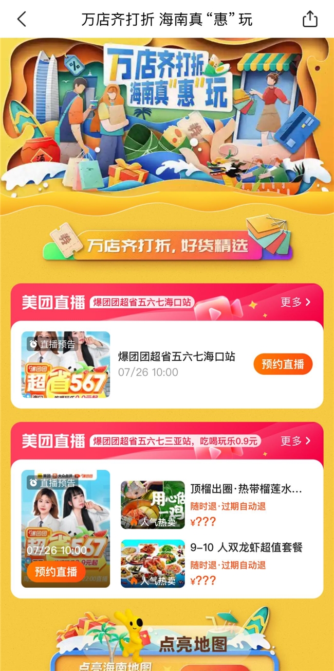 “萬店齊打折 海南真惠玩”主題營(yíng)銷活動(dòng)由海南省旅游和文化廣電體育廳和美團(tuán)聯(lián)合發(fā)起,活動(dòng)覆蓋了海南省內(nèi)十八個(gè)城市,全品類商家紛紛參與,為游客們帶來了前所未有的優(yōu)惠和福利;顒(dòng)期間海南省旅文廳聯(lián)合美團(tuán)攜手一萬家商戶,為廣大消費(fèi)者和游客提供了不低于1000萬遠(yuǎn)的補(bǔ)貼折扣,用戶只要在美團(tuán)App、大眾點(diǎn)評(píng)App搜索“萬店齊打折”等字樣,即可進(jìn)入專題頁(yè),參與各類福利活動(dòng)。