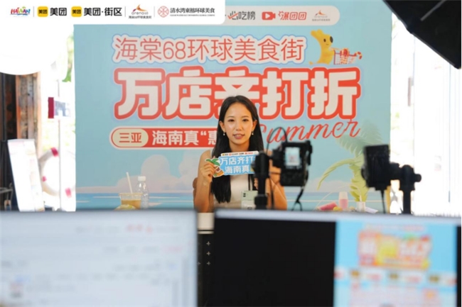 三亞海棠68環(huán)球美食街區(qū)同樣熱鬧非凡,“爆團(tuán)團(tuán)”爆品直播間活動(dòng)落地線下,各種街區(qū)爆款秒殺活動(dòng)讓游客們應(yīng)接不暇。