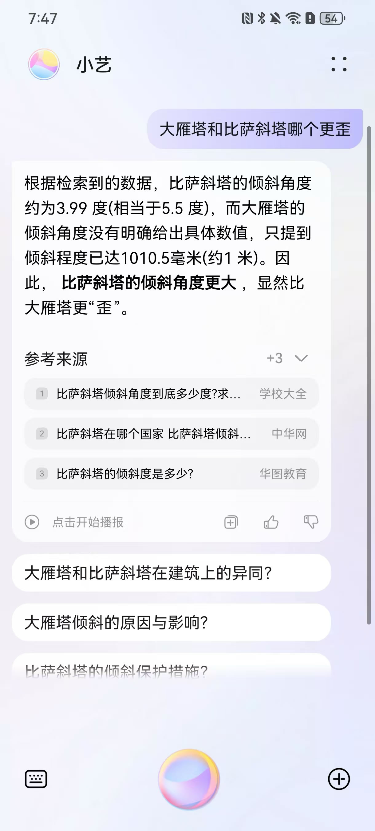 確定好目的地之后,到底怎么玩?對(duì)大多數(shù)人來說,既要規(guī)劃詳細(xì)、又要細(xì)節(jié)不出紕漏的“完美旅行攻略”非常費(fèi)時(shí)費(fèi)力。而小藝可以從特色景點(diǎn)、住宿、餐飲、注意事項(xiàng)等多個(gè)維度出發(fā),結(jié)合用戶確定的旅行目的地,為你解答各種旅行知識(shí),堪稱旅行界的百科全書。用戶只需長按華為手機(jī)電源鍵或者對(duì)手機(jī)說“小藝小藝”即可喚醒小藝,不論是詢問當(dāng)?shù)氐娜宋闹R(shí)、歷史典故,還是推薦熱門景點(diǎn)、美食小吃,小藝都能對(duì)答如流,幫助大家更快速了解目的地的相關(guān)信息。比如你可以直接問它“為什么景德鎮(zhèn)的瓷器很出名”、大雁塔和比薩斜塔哪個(gè)更歪” “為什么很多人喝不慣北京豆汁兒”,通過各種問題逐漸了解到目的地的各種信息,幫助提升旅行體驗(yàn)。
