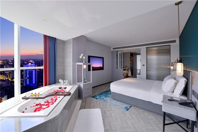客房哲學:320間客房搭配全景落地窗設(shè)計,干濕分離設(shè)計搭配臨窗浴缸,申寶冷暖床墊實現(xiàn)“冬暖夏涼”智能溫控,高端雅蘭布草,細節(jié)處彰顯東方待客之道。