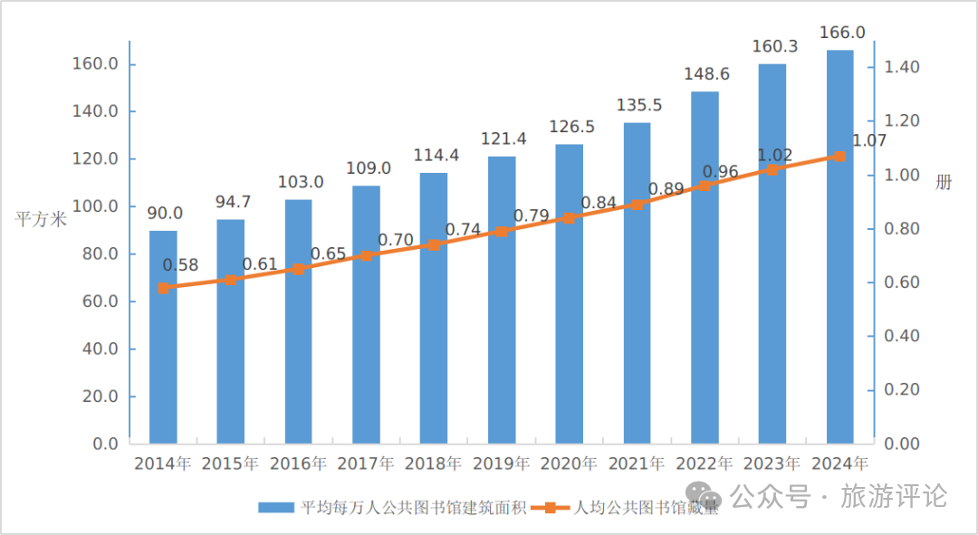 2024年末,全國平均每萬人公共圖書館建筑面積166平方米,比上年末增加5.7平方米;全國人均圖書藏量1.07冊,比上年末增加0.05冊;全年全國人均購書費1.5元,與上年基本持平。