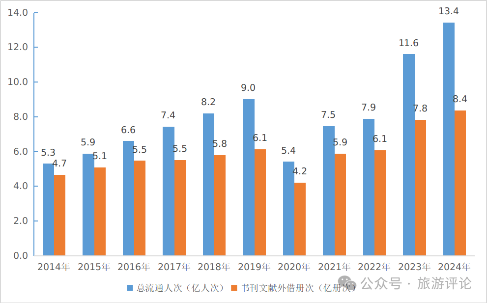 2014—2024年全國公共圖書館總流通人次及書刊外借冊次