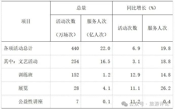 全年全國群眾文化機構(gòu)共組織開展各類文化活動440萬場,同比增長6.9%;服務22億人次,同比增長19.8%!