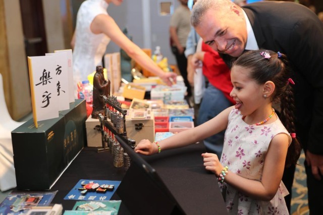 6月12日,一名女孩在埃及開羅舉辦的“茶和天下”尼羅雅集活動現場體驗“遇見孔子”非遺文創(chuàng)產品。新華社記者 隋先凱 攝