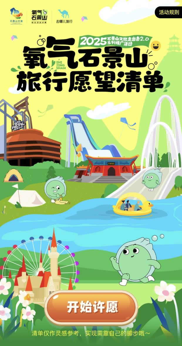 在“去哪兒”旅行APP上線“氧氣石景山”文旅專題頁,不僅整合酒店榜單、景區(qū)門票、優(yōu)質(zhì)攻略等核心文旅資源,更特別設(shè)置石景山區(qū)對口支援和協(xié)作地文旅產(chǎn)品版塊,實(shí)現(xiàn)“石景山推廣+支援地區(qū)助銷”雙重價(jià)值。同步推出的“旅行打卡愿望清單”H5,線上用戶可點(diǎn)亮自己的石景山旅游心愿,生成專屬旅行愿望清單;在高校路演活動中,大學(xué)生可分享H5到社交媒體作為參與活動的入場券——既為高;顒宇A(yù)熱,更成為高校路演入場憑證,串聯(lián)起“線上互動-線下參與”的閉環(huán)。