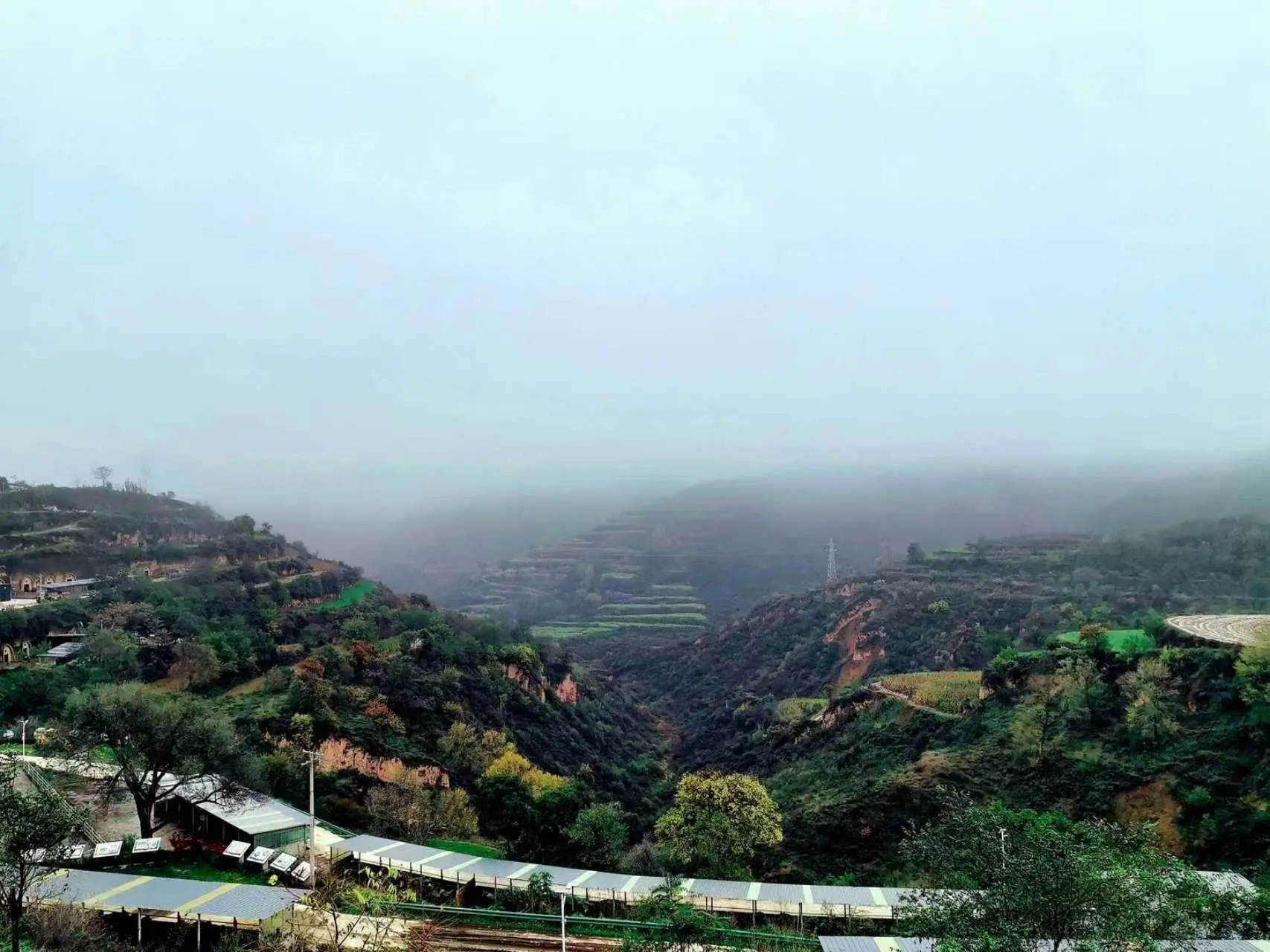 大寨鄉(xiāng)海拔1540米、北緯35.38度,屬溫帶半干旱氣候,四季分明、風(fēng)景宜人,豐富的水資源和廣袤的植被共同構(gòu)筑了獨特的局部小氣候,使得大寨鄉(xiāng)在降雨之后,常常云霧繚繞。如紗的霧氣縈繞于山巒溝壑之間,將遠山近樹渲染成一幅流動的水墨畫。