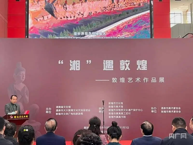 央廣網(wǎng)長(zhǎng)沙10月28日消息(記者 黃珂嵐 實(shí)習(xí)記者 蔣好)10月28日上午,一場(chǎng)跨越千山萬(wàn)水、連接千年文明的文化盛宴“湘”遇敦煌——敦煌藝術(shù)作品展,在湖南省文化館盛大開(kāi)幕。此次展覽不僅是敦煌文化與湖湘文化的一次深度對(duì)話,更為兩地文化交流互鑒構(gòu)建新橋梁。據(jù)悉,展覽將持續(xù)至11月3日結(jié)束。