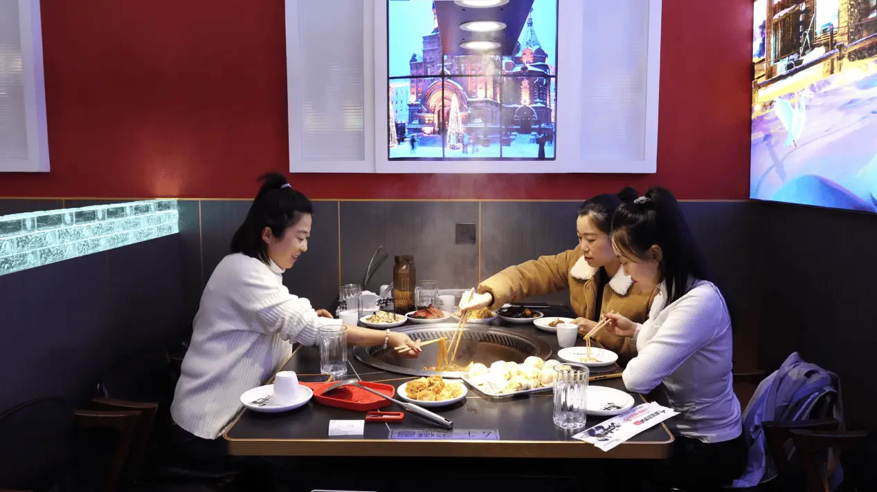走進同江市一家人氣很旺的鐵鍋燉餐館,濃郁的肉香混雜著酸菜的清爽撲面而來,鐵鍋里的大鵝與酸菜咕嘟作響,店內(nèi)十余張餐桌座無虛席,食客們的談笑聲與鐵鍋的燉煮聲交織成冬日里熱鬧的煙火氣。這是同江商家搶抓冰雪季商機推出特色優(yōu)惠套餐帶來的人氣。