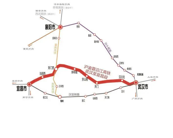 滬渝蓉高鐵武宜段位于湖北省境內,起自武漢市,經天門市、荊門市,終至宜昌市。線路正線全長314公里,設計時速350公里。開通后,宜昌至武漢的鐵路旅行時間將從目前的2小時大幅壓縮至最快1小時09分。