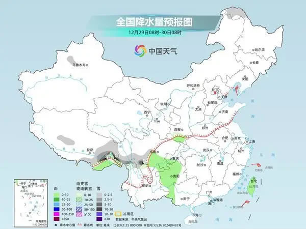 預計30日夜間開始,隨著暖濕氣流增強,西藏東部、四川、貴州、重慶、陜西南部、湖北西部等地降水又會發(fā)展增多。之后,水汽繼續(xù)向東、向北輸送,黃河以南地區(qū)將出現(xiàn)一輪“跨年”降水。目前來看這輪降水范圍廣,但強度不大,多是小到中雨雪量級。公眾需密切關注臨近預報,做好相關防范措施。