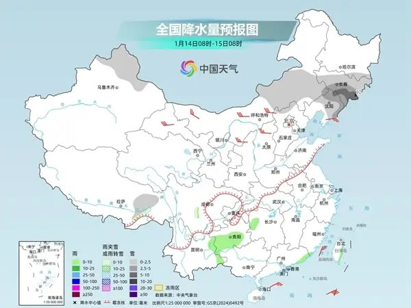 后天,內(nèi)蒙古中部、吉林東部、新疆沿天山地區(qū)和伊犁河谷、西藏東北部、川西高原東部等地部分地區(qū)有小到中雪或雨夾雪,其中,新疆沿天山西部等地部分地區(qū)有大雪。西藏東南部、湖北西南部、湖南西北部、重慶東南部、貴州東北部、云南中南部、廣西西部等地部分地區(qū)有小雨。