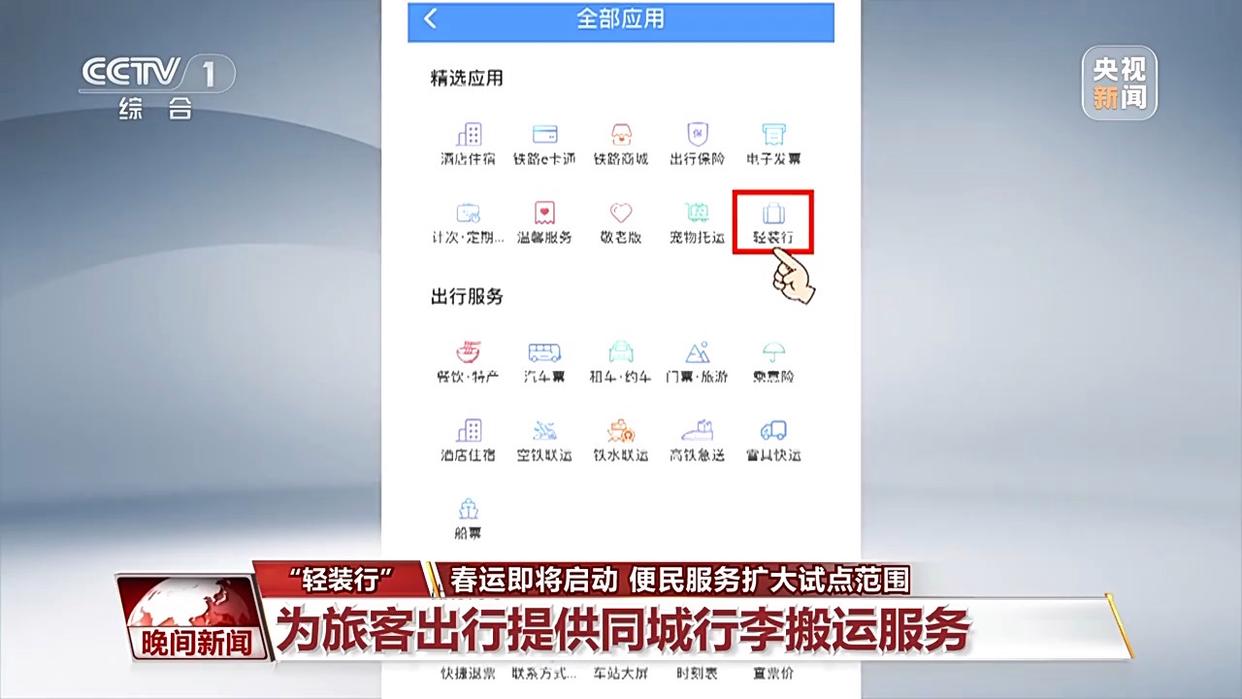 “輕裝行”是鐵路部門(mén)為旅客出行提供的“門(mén)到站”“站到門(mén)”同城行李搬運(yùn)服務(wù)。已購(gòu)車(chē)票的旅客只需打開(kāi)鐵路12306App或微信小程序,在首頁(yè)中部應(yīng)用欄向左滑動(dòng),找到“全部應(yīng)用”,點(diǎn)擊進(jìn)入即可找到“輕裝行”模塊,根據(jù)需求預(yù)約下單。