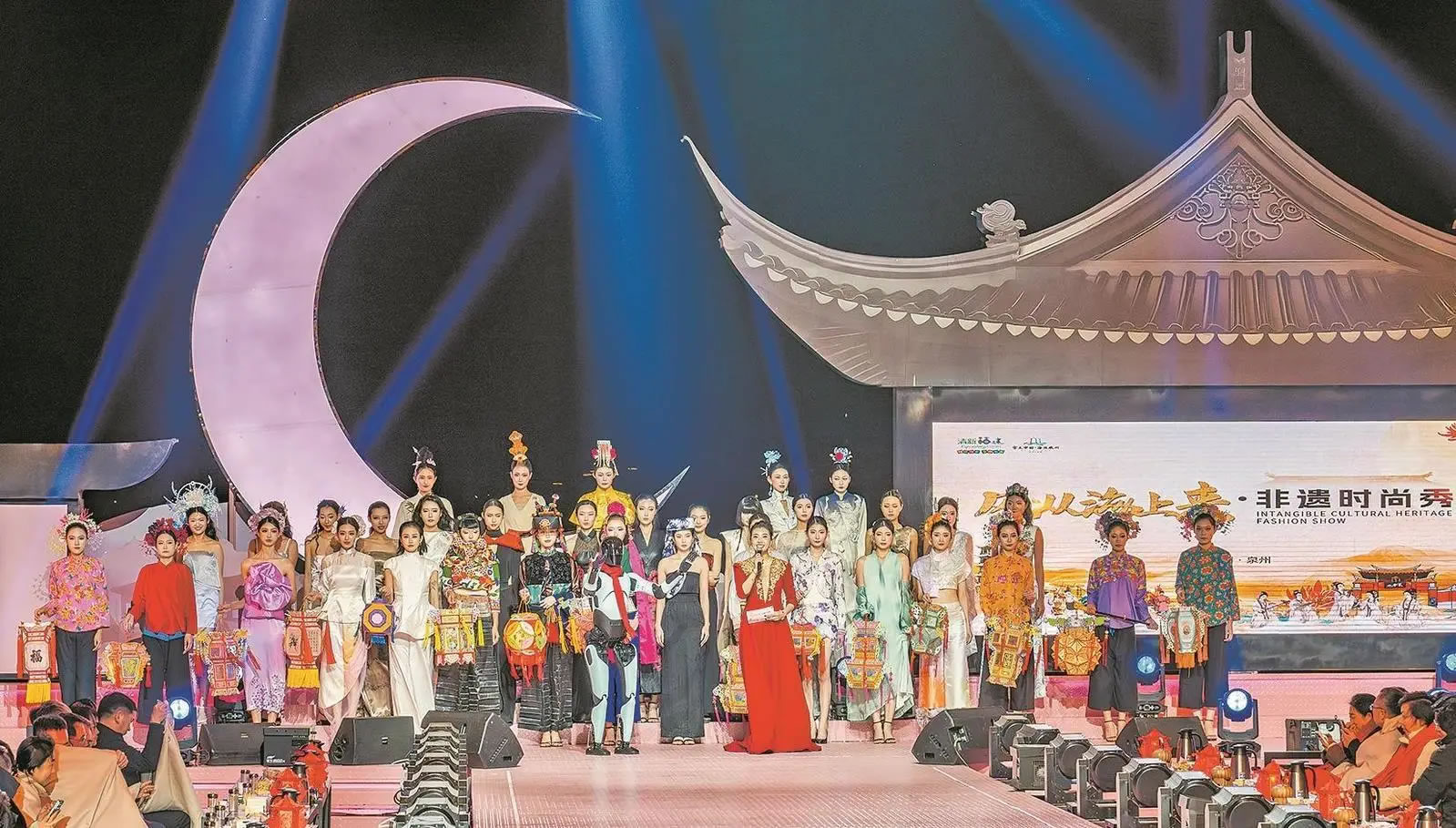 時尚秀分上、下兩篇。開場展示宋代迎客禮儀,還原宋人風(fēng)雅。上篇“海上生明月”以生活化的“海”為主線,通過《月娘月光光》表演唱、南音《庭院七弦響》、情景表演《海的女兒》等節(jié)目,融合惠安女織網(wǎng)、蟳埔女簪花、茶道香道等非遺元素,搭配模特走秀,展現(xiàn)人與海的和諧共生。下篇“匠心映月輝”以非遺技藝的“匠”為核心,國潮樂隊《奇跡》、南少林武術(shù)《少林雄風(fēng)》、民間舞蹈《雙鐵尺舞》等節(jié)目,將非遺技藝與現(xiàn)代設(shè)計結(jié)合,凸顯力與美的碰撞。尾聲,全體模特手持花燈、瓷器等非遺作品返場,與歌曲《泉州人》共鳴,寓意“燈火萬家明”,點亮泉州夜空。