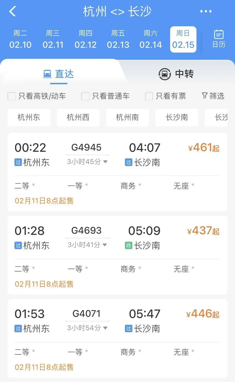 比如,2月15日杭州前往武漢、長(zhǎng)沙、南昌、貴陽等地,無論是普速列車還是動(dòng)車組列車,當(dāng)天所有車次已經(jīng)基本全部售罄,只剩極個(gè)別車次硬座、無座席位還有余票。