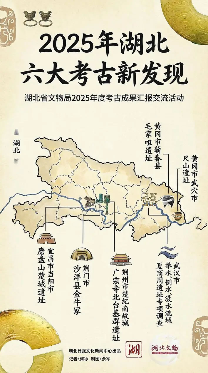 2月3日,在湖北省文物局舉辦的2025年度湖北省考古成果匯報交流活動上,正式公布了2025年湖北六大考古新發(fā)現(xiàn)。分別為:黃岡市武穴市尺山遺址、黃岡市蘄春縣毛家咀遺址、宜昌市當(dāng)陽市磨盤山楚城遺址、荊州市楚紀(jì)南故城廣宗寺北臺基群遺址、荊門市沙洋縣金牛冢及武漢市舉水、倒水、灄水流域夏商周遺址專項調(diào)查。
