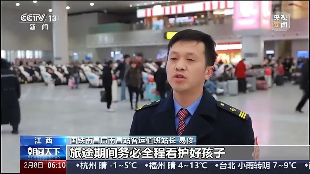 國(guó)鐵南昌局南昌站客運(yùn)值班站長(zhǎng) 易俊:旅途期間務(wù)必全程看護(hù)好孩子,切勿讓孩子脫離視線(xiàn)。如需幫助,可聯(lián)系車(chē)站工作人員和民警,謹(jǐn)防孩子走失、接觸陌生人員。