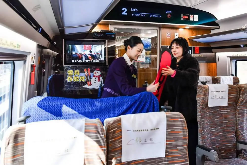 旅客可通過鐵路12306官方客戶端內(nèi)的“雪具便利行”功能,查詢服務(wù)車次、辦理預(yù)約并支付相關(guān)費用后即完成辦理。辦理成功后,旅客可在乘車當日將妥善包裝的雪具帶至車站,經(jīng)設(shè)有“雪具便利行”標識的通道進行安檢和驗票,車站工作人員將同步核驗車票與雪具運送預(yù)約信息。上車后,旅客可在列車工作人員引導(dǎo)下,將雪具放置于鄰近的“雪具存放區(qū)”。列車運行期間,工作人員將定時巡檢,共同保障雪具安全。