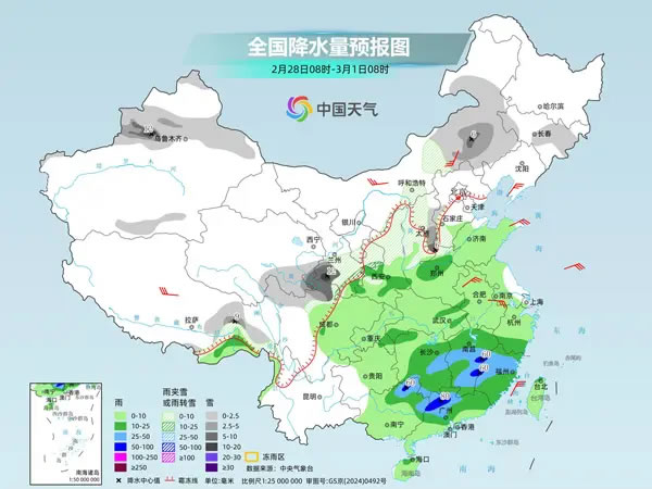 央視網消息:據(jù)中國天氣網消息,今天(2月27日),南方降雨范圍縮減,降雨重心南移至華南,部分地區(qū)有大雨。明后天,我國新一輪大范圍降水過程將接踵而至,江南、華南等地陰雨頻繁,需防范連續(xù)降雨對交通出行等方面的不利影響。受頻繁雨雪和冷空氣影響,未來幾天,北方氣溫多波動起伏,華北、東北部分地區(qū)氣溫偏低,需注意保暖。