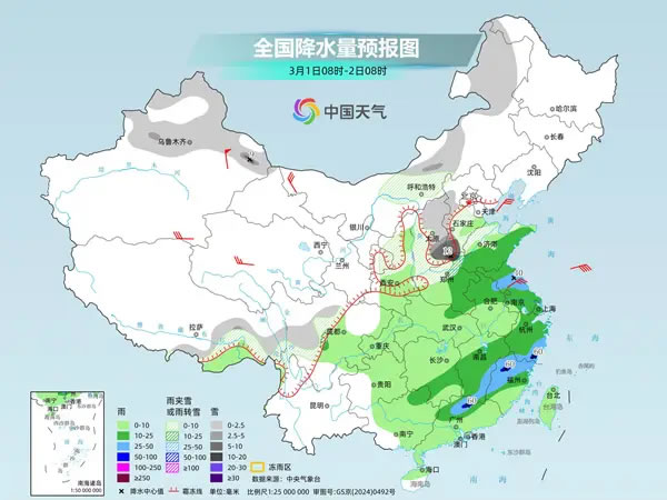 后天,內蒙古中東部、新疆北部、甘肅東部、陜西北部、華北中南部、黃淮北部等地部分地區(qū)有小到中雪或雨夾雪,其中,山西南部、河北南部、河南北部等地部分地區(qū)有大到暴雪。黃淮大部、江淮大部、江南中東部和南部、華南北部等地部分地區(qū)有中到大雨,其中,浙江南部、福建西北部、廣東北部等地局地有暴雨。