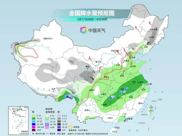 今起三天,南方仍多陰雨,西南地區(qū)東部、江淮、江南西部和北部以穩(wěn)定性降水為主,會(huì)有春雨綿綿的感覺(jué)。中央氣象臺(tái)預(yù)計(jì),今天,新疆南部、西藏大部、青海大部、甘肅南部、寧夏南部、川西高原西部和北部等地部分地區(qū)有小到中雪或雨夾雪,其中,新疆西南部、西藏東北部和南部、青海東部、甘肅南部等地部分地區(qū)有大到暴雪。西藏東南部、湖北東部和中南部、安徽南部、湖南北部、江西西北部、重慶東南部、貴州南部和東北部、云南西北部等地部分地區(qū)有中到大雨,其中,西藏東南部等地局地有暴雨。