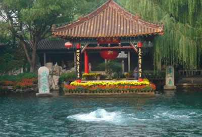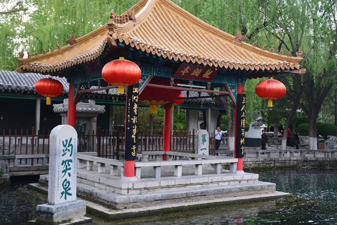 趵突泉的南大門橫匾“趵突泉”藍(lán)底金字,是清朝乾隆帝的御筆,有人譽(yù)為中國園林“第一門”。