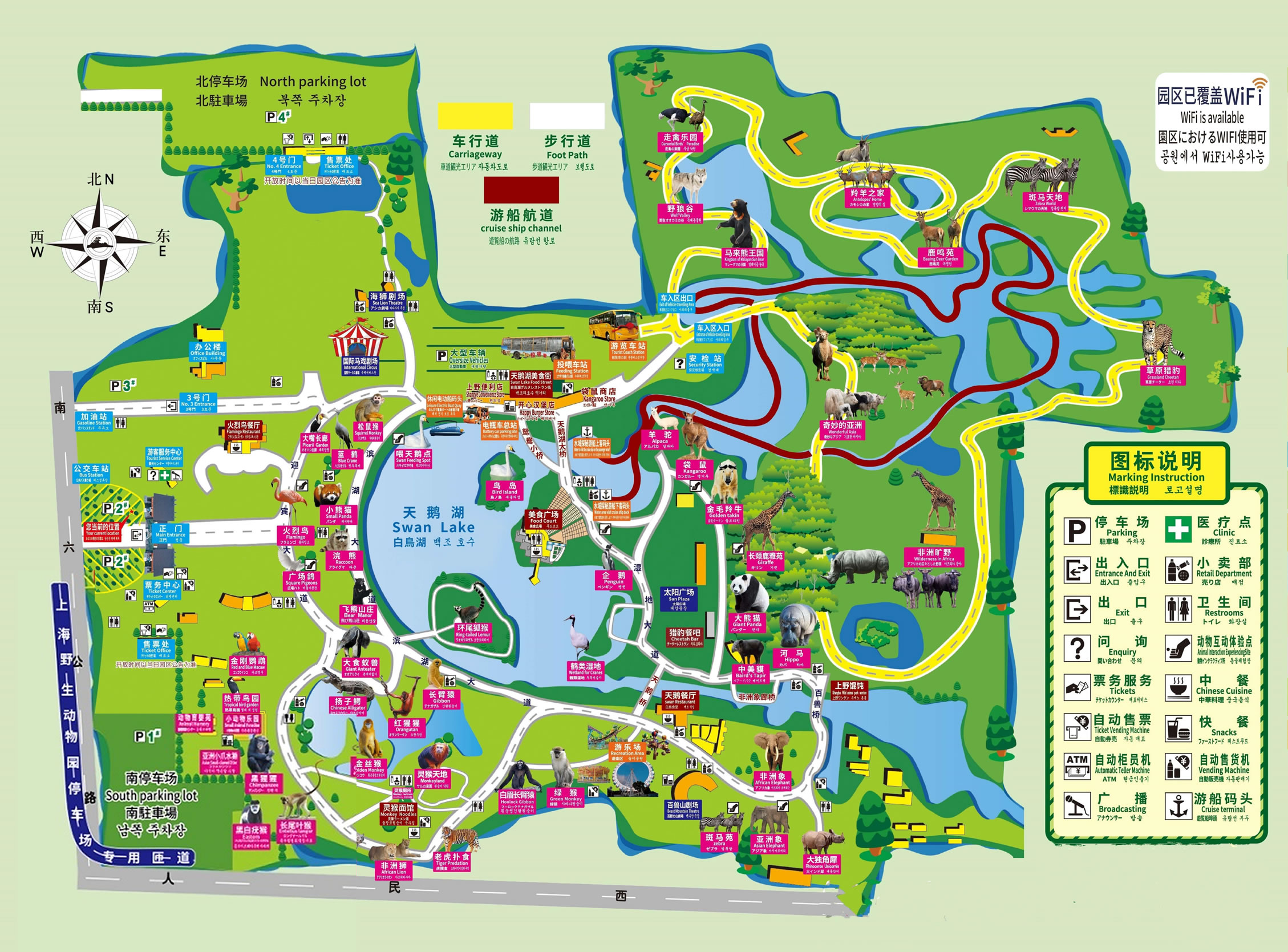 上海野生動物園現(xiàn)有車入?yún)^(qū)、步行區(qū)兩大區(qū)域。車入?yún)^(qū)分布著奇妙的亞洲、非洲曠野、優(yōu)雅長頸鹿、最美閃電俠、草原霸主、荒野大力熊、森林之王、白虎領(lǐng)地、野狼谷、馬來熊王國10大主題區(qū)域。步行區(qū)則分布著大熊貓館、鶴類濕地、火烈鳥展區(qū)、企鵝館、天鵝湖、羊駝苑、紅猩猩館、中美貘館、小動物樂園、鸚鵡館、河馬館、白眉長臂猿展區(qū)、大食蟻獸展區(qū)、鱷魚島、狐猴島、浣熊展區(qū)、金絲猴島、飛熊山莊、綠猴區(qū)、白虎展區(qū)、松鼠猴、小熊貓區(qū)、黑猩猩館、袋鼠坡、長頸鹿雅苑、亞洲象展區(qū)、金毛羚牛館、國禮非洲獅展區(qū)、熱帶鳥園、斑馬苑、非洲象展區(qū)、老虎撲食區(qū)、白頰長臂猿島、藍(lán)鶴、大獨(dú)角犀、大嘴長廊、靈猴天地、亞洲小爪水獺展區(qū)、太陽廣場共39個(gè)館區(qū)。