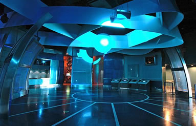 太空影院是中國第一家采用視頻拼接、圖像處理、觀眾互動、電腦集成等技術(shù)綜合而成的多媒體球幕影院。Digistar3系統(tǒng)共有6臺視頻投影儀,照明功率達(dá)到了4800瓦。它們在計算機(jī)的控制下,在直徑13米的球形銀幕透射出6幅銜接的影像,組成一幅完整的全球幕影象。整個影院有69個座位,座位的傾斜度達(dá)到了23度,觀眾幾乎是躺著看電影的。最新奇的是每個座位的扶手上有一個控制按鈕,觀眾可以按此按鈕控制電影劇情的發(fā)展,達(dá)到了“畫隨人動,人隨畫思”的境界。