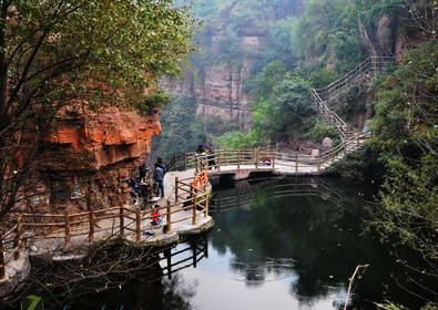 紅崖峽谷在太岳山西麓,屬太行山系,是中生代燕山運(yùn)動(dòng)時(shí)期隆起,又經(jīng)過(guò)新生代西馬拉雅運(yùn)動(dòng)改造形成的山地。其地貌屬大起伏喀斯特侵蝕中山,屬于石質(zhì)山區(qū),地貌類型多樣,巖石主要有片麻巖、花崗巖、石灰?guī)r和沙石巖。