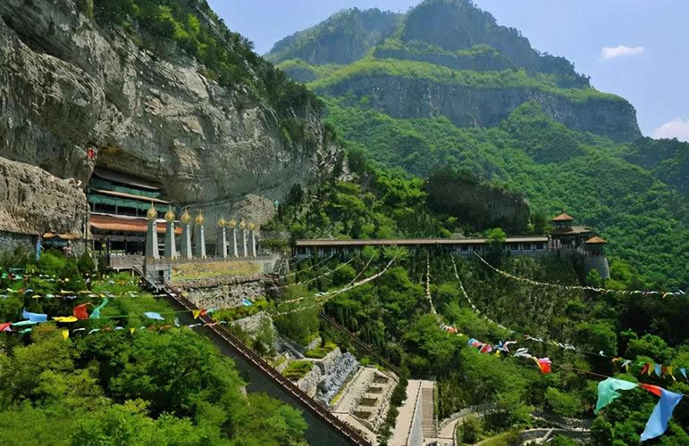 天橋是因修筑在懸崖絕壁上的棧道而得名,有千余年的歷史。長(zhǎng)300余米,寬 1 米多,上離峰頂80余米,高入云表;下距溝底300余米,懸于危巖上。每逢雨過云涌,人在橋上過,云在腳下飛,使人有平步青云,飄飄欲仙之感。景區(qū)內(nèi)主要建筑是洞神宮、祖師殿、七真殿、水母殿、懸空長(zhǎng)廊等和回頭看柏龍、兔橋、須彌石等名勝景觀。有孔明和張良等人的修行洞。此外還有中國(guó)古代最險(xiǎn)絕的軍事堡壘——石勒寨,地勢(shì)險(xiǎn)峻,易守難攻。