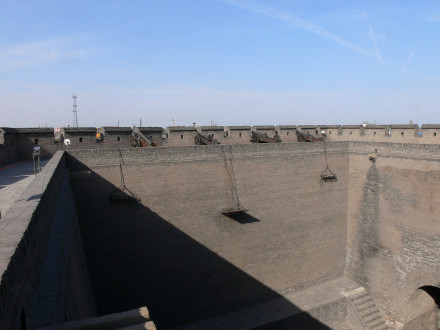 康熙四十三年(1703年)因皇帝西巡路經(jīng)平遙,而筑了四面大城樓,使城池更加壯觀。平遙城墻總周長6163米,墻高約12米,把面積約2.25平方公里的平遙縣城一隔為兩個(gè)風(fēng)格迥異的世界。