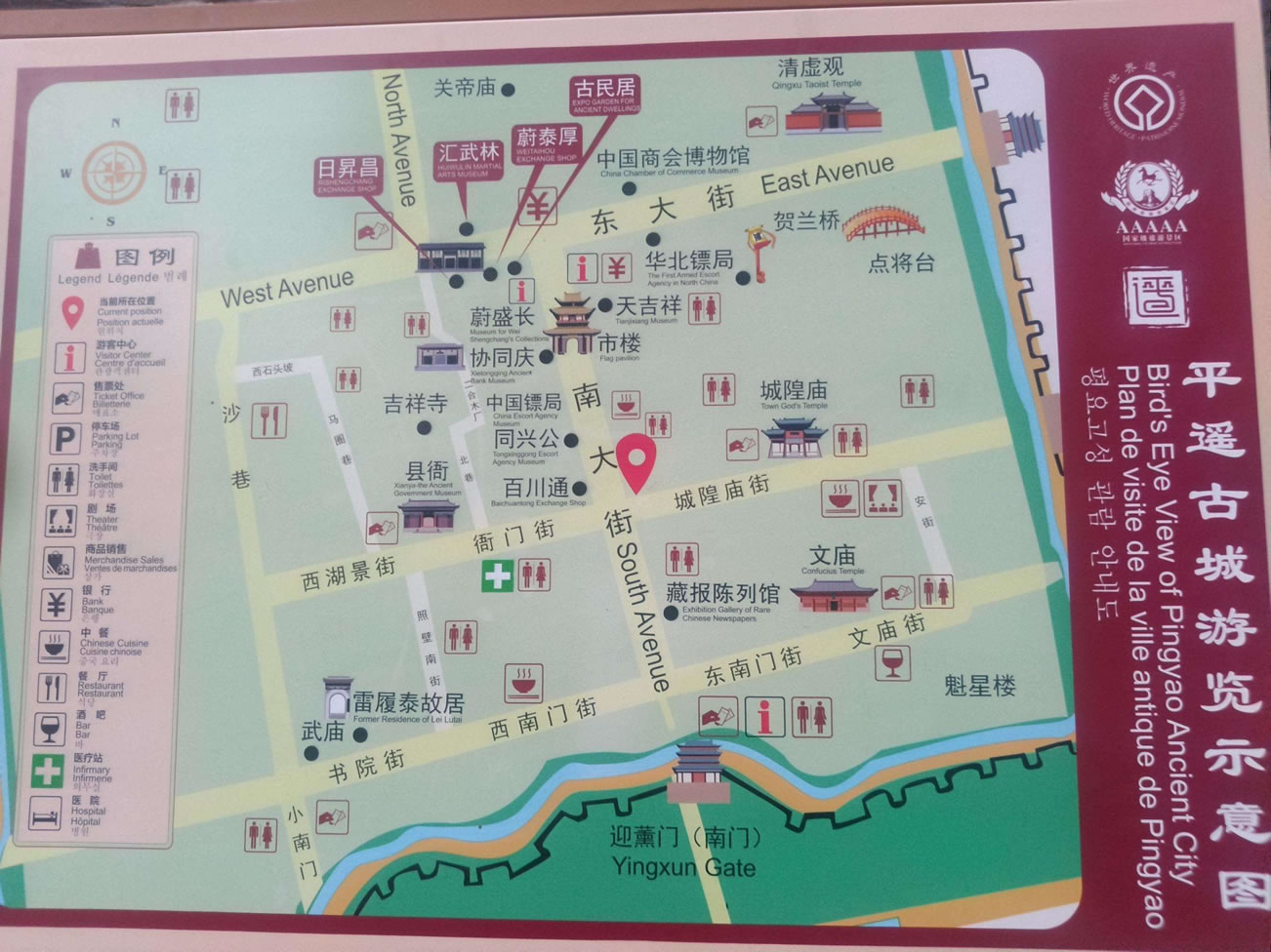 平遙古城素有“中國古建筑的薈萃和寶庫”之稱,文物古跡保存之多、品位之高實(shí)為國內(nèi)所罕見。其中有始建于西周,擴(kuò)建于明洪武3年(1370年),規(guī)模宏大,氣勢雄偉的國內(nèi)保存最完整的古城墻;有始建于北漢天會(huì)七年(963年)被列入我國第三位的現(xiàn)存最珍貴的木結(jié)構(gòu)建筑鎮(zhèn)國寺萬佛殿。殿內(nèi)的五代彩塑堪稱珍品,是研究中國早期彩塑的樣本;有始建于北齊武平二年(571年)、被譽(yù)為“中國古代彩塑藝術(shù)寶庫”,現(xiàn)存宋元明清彩塑2052尊的雙林寺;有中國宋金時(shí)期文廟的罕見實(shí)物——文廟大成殿;有中國金融上的開山鼻祖,被譽(yù)為“天下第一號”、“匯通天下”的“日升昌”票號;有始建于唐顯慶二年,國內(nèi)古建筑中罕見的“懸梁吊柱”奇特結(jié)構(gòu)清虛觀。觀內(nèi)20余尊木雕神像是研究中國古代木雕造像藝術(shù)和道教發(fā)展的稀有之物;有遍布古城內(nèi)外1000通碑刻及年代不一、形式多樣、色彩續(xù)紛的各種琉璃實(shí)物。同時(shí),平遙古城是中國古代民居建筑的薈萃中心之一。古城內(nèi)現(xiàn)存4000處古、近代民居建筑中,有400余處典型地體現(xiàn)著中國古、近代北方民居建筑的風(fēng)格和特點(diǎn)。