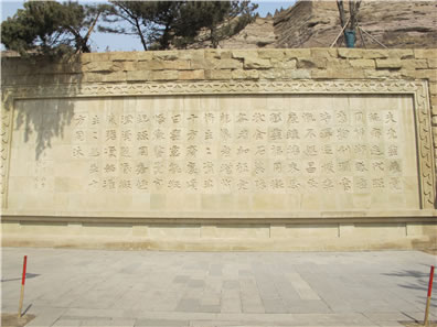 位于云岡石窟一窟山門前的“比丘尼曇媚造像記”石刻,為公元503年(景明四年)的題記。此碑刻有文字110個,再現(xiàn)了當(dāng)時的社會背景,表達(dá)了發(fā)愿人比丘尼曇媚對佛教的高度信仰與虔誠以及希望佛教振興發(fā)展的愿望,文筆優(yōu)美,堪稱佛教發(fā)愿文之最。此碑也向我們展示了北魏時期一種特有的字體。因這種字體在當(dāng)時多用于碑文,所以后人稱它為魏碑體。魏碑字體外方內(nèi)圓、拙樸有力,是隸書向楷書過渡的字體。由此看來,魏碑書法應(yīng)是北魏平城時的創(chuàng)造。原物很小,只有30厘米高,28厘米寬,于1956年20窟前考古發(fā)掘,現(xiàn)存于云岡博物館中。
