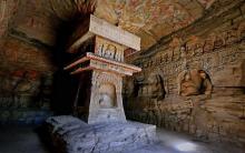 在風(fēng)化殘破的第14窟中,正壁為一佛二菩薩主像,除下層龕像為晚期補刻外,中上層龕像大致有計劃雕鑿。后室東西壁分作三層:上層以盝形龕交腳菩薩為主體,內(nèi)側(cè)有一小坐佛圓拱龕;中層為較大、較深的坐佛圓拱龕,龕外兩側(cè)為三層出檐閣樓塔;下層深龕仿佛雕刻了帷幔,東壁為坐佛,西壁龕內(nèi)未完成即被改刻。整個洞窟設(shè)計嚴(yán)謹(jǐn)、雕刻精美。