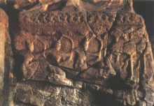 穿過神柱林立的佛光大道向西,呈現(xiàn)于世人眼前的是兩面相對的扇形皇家禮佛浮雕墻。這組正面相對的浮雕墻總體呈圓弧狀,長約20米、高約4米,畫面構(gòu)圖完美,雕刻細(xì)致,以高浮雕的形式,生動表現(xiàn)了北魏皇家盛大的帝后禮佛圖。車轔轔、馬蕭蕭的現(xiàn)場氣氛,充分再現(xiàn)了北魏當(dāng)時皇帝、皇后前往禮佛的莊嚴(yán)肅穆的宏大場面,這種場面讓人自然聯(lián)想到1500多年前云岡石窟作為皇家寺院曾經(jīng)的輝煌,讓人舉目流連。