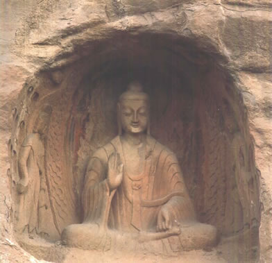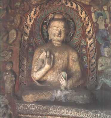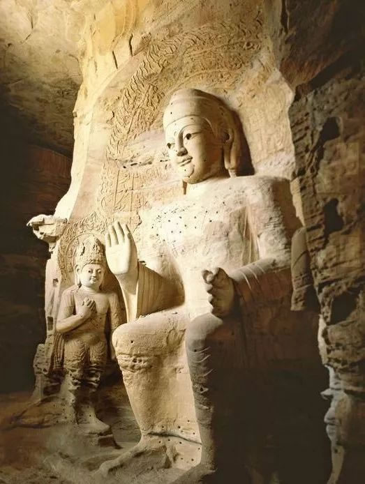 第19窟主佛像結(jié)跏趺坐,佛像耳輪齊肩,下頜崩毀,著袒右肩袈裟,輕薄貼體,衣紋簡潔明快。佛像右手舉胸施無畏印,左手掌心向上握法衣于膝上,以表達(dá)佛法的無畏與傳承?咄鈻|西耳洞中,各雕刻一尊倚坐佛像,西耳洞佛像,耳廓寬大垂肩,體魄挺拔勁健。這種分窟安置三世佛的布局設(shè)計,既有變化,又顯莊嚴(yán),是北朝石窟形制的新創(chuàng)舉。